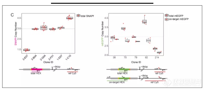 ▲PCR进行两种细胞系中的标签基因检测。U2OS- TPR-SNAP标签基因整合总数检测 (左);