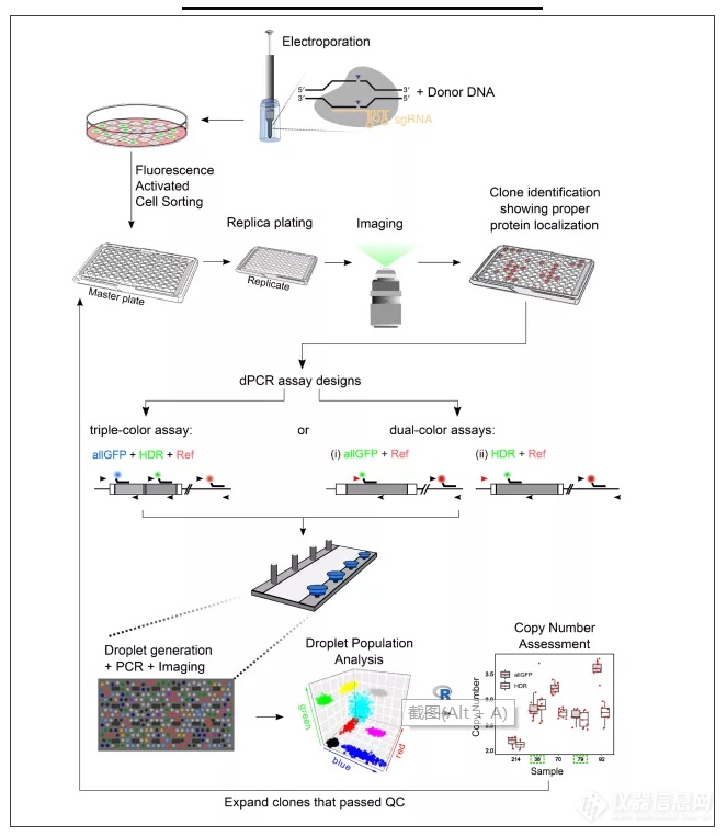 欧洲分子生物学实验室研究人员Moritz Kueblbeck•○•, Andrea Callegari等在bioRxiv分享了一项基于CRISPR方法优化的技术文章,目的在于提升从基因编辑产生的细胞中筛选纯合子的效率★-△。众所周知▪,使用CRISPR精确敲入 (knock-in) 外源性DNA后,产生的基因编辑克隆需要严格的筛选才能得到目的克隆(纯合子)。基于常规PCR和Southern Blot检测目的克隆的方法耗时长、需要大量劳动力。因此研究人员对传统方法进行了优化,采用荧光标记蛋白和naica数字PCR联合的方法,精准快速的实现了基因编辑后目的克隆的筛选,大大降低了检测的人力、物力、时间成本。