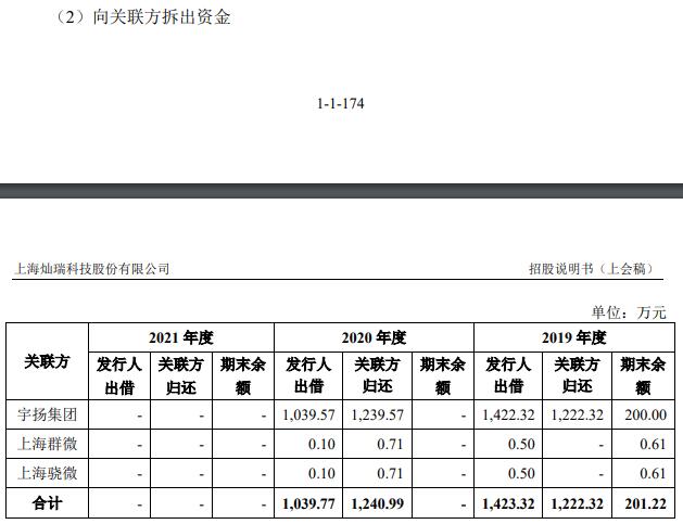 灿瑞科技存在向关联方拆出资金。2019年、2020年,公司向宇扬集团拆出资金1422.32万元◇△◇、1039-.57万元。