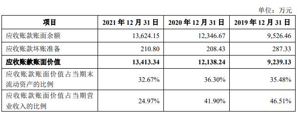 2019年末、2020年末、2021年末,灿瑞科技应收账款账面余额分别为9,526▪●.46万元●-▽、12,346.67万元、13,624▷…•.15万元○◇,应收账款的账面价值分别为9,239◁●△.13万元、12,138.24万元、13△,413.34万元,应收账款账面价值占当期营业收入的比例分别为46.51%□=、41.90%、24.97%。各期,灿瑞科技应收账款周转率分别为3.24、3.11、4-●★.82,同行业可比公司应收账款周转率平均值分别为17.84、17.13、7.15◁-。