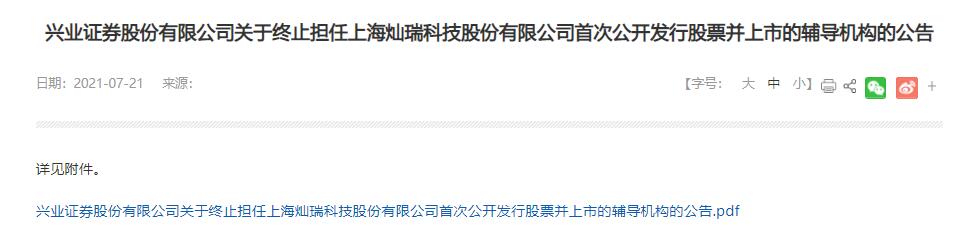 2021年7月21日,上海证监局网站发布《兴业证券股份有限公司关于终止担任上海灿瑞科技股份有限公司首次公开发行股票并上市的辅导机构的公告》。兴业证券与灿瑞科技签订了《上海灿瑞科技股份有限公司与兴业证券股份有限公司关于首次公开发行股票之辅导协议》,成为公司首次公开发行股票的辅导机构…□,于2019年12月9日向上海证监局提交了辅导备案申请。综合考虑灿瑞科技的上市计划安排,经兴业证券与灿瑞科技友好协商□=-,双方一致同意终止辅导,并签署了《上海灿瑞科技股份有限公司与兴业证券股份有限公司终止辅导协议》,因此兴业证券终止担任灿瑞科技首次公开发行股票并上市的辅导机构,并终止相关辅导工作。