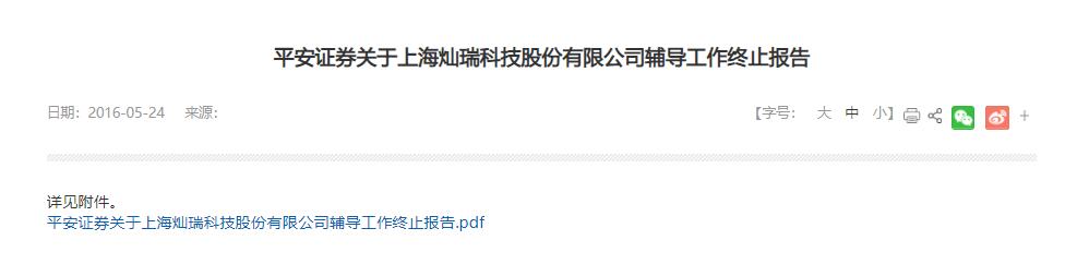2016年5月24日,上海证监局网站发布《平安证券关于上海灿瑞科技股份有限公司辅导工作终止报告》▲。2015年11月23日,平安证券与灿瑞科技签署《上海灿瑞科技股份有限公司与平安证券有限责任公司关于首次公开发行股票并上市之辅导协议》,平安证券作为灿瑞科技的辅导机构向上海证监局递交了辅导备案材料•▼。鉴于平安证券与灿瑞科技在申报时间上存在异议,经双方友好协商,一致同意终止辅导,并与2016年5月10日签署了《关于解除上海灿瑞科技股份有限公司与平安证券有限责任公司关于上海灿瑞科技股份有限公司上市工作的一揽子协议以及上海灿瑞科技股份有限公司与平安证券有限责任公司之首次公开发行股票并上市之辅导协议的协议》▼,因此平安证券终止担任灿瑞科技首次公开发行股票并上市的辅导机构,并终止相关辅导工作◇•△。