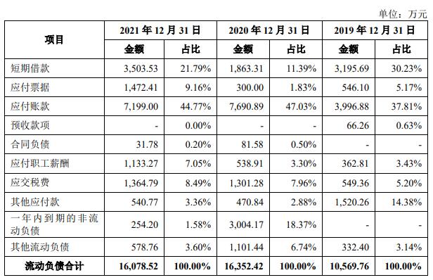报告期各期末▽,公司短期借款金额分别为3195.69万元、1863.31万元、3503.53万元☆○,占流动负债的比例分别为30.23%□○◆、11.39%、21○●.79%★▷。2019年末◇=•,短期借款金额较高,系由于当期末未终止确认的应收票据贴现余额较高。2021年末…□,公司保证借款余额较高导致短期借款金额较高。