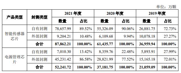 公司主要产品为智能传感器芯片和电源管理芯片●,公司智能传感器芯片的封装测试主要为自有封测,电源管理芯片的封装测试主要为外部封测。今年3月23日公布的《发行人及保荐机构关于首轮审核问询函的回复》中显示▪=◇,2019年、2020年▼☆●、2021年,灿瑞科技的电源管理芯片外部封测占比72••▽.01%•-…、77.52%、86.58%。