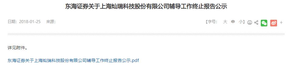 2018年1月25日,上海证监局网站发布《东海证券关于上海灿瑞科技股份有限公司辅导工作终止报告公示》。2017年4月21日=◆…,东海证券与灿瑞科技签订了《东海证券股份有限公司与上海灿瑞科技股份有限公司首次公开发行股票辅导协议》,并于同日向上海证监局报送了辅导备案登记材料。辅导工作终止报告公示显示,经双方友好协商一致•◁,同意终止辅导协议,并签署了《关于终止东海证券股份有限公司与上海灿瑞科技股份有限公司首次公开发行股票辅导协议的协议》。因此,东海证券终止对灿瑞科技首次公开发行股票并上市的辅导工作。