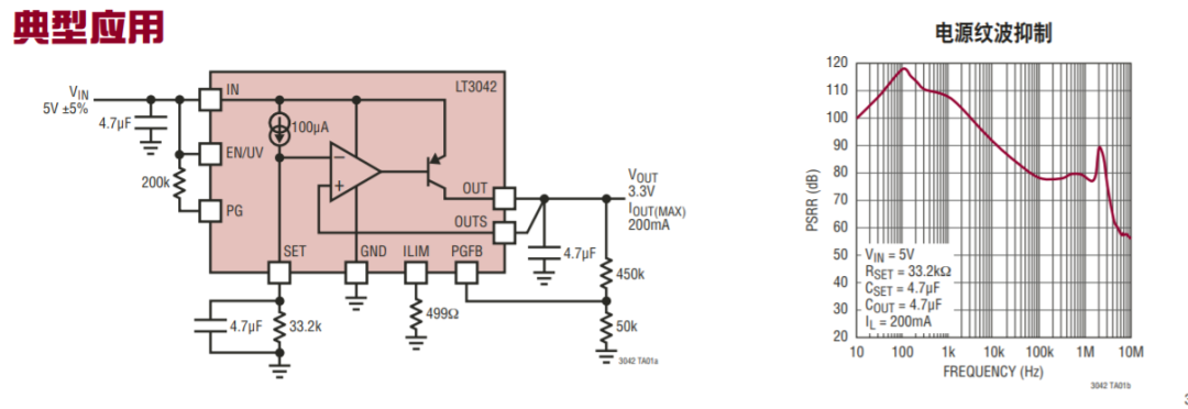 图8:LT3042的典型应用电路(左)和PSRR参数(右)(图源:ADI)