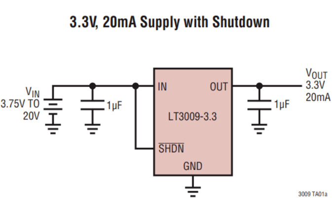 贸泽电子在售的来自制造商Analog Devices(ADI)的LT3009,就是一款可以同时满足微安(uA)级静态工作电流与20毫安(mA)大驱动能力的LDO芯片。具体来看,LT3009无负载静态电流为3uA,可以在280mV压差(输入/输出)情况下提供20mA输出电流,输入电压范围为1.6V至20V,输出电压范围为0.6V至19.5V。此外,LT3009仅需要1uF的电容就可以保证输出电源的稳定性和瞬时响应,内部集成了限流、限温、电池接反保护和反向电流保护等防护功能,可有效保证便携设备的用电安全。