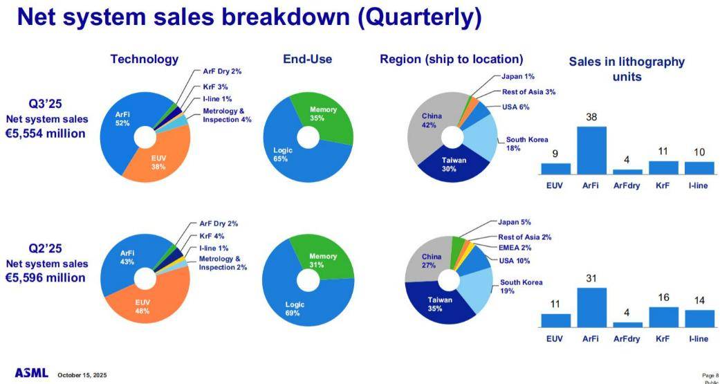 从ASML的财报来看,中国大陆曾是 ASML 的重要市场,2020-2022 年期间,ASML 向中国大陆出口的 DUV 光刻机销量占其全球 DUV 总销量的 30%-35%,并非 “全球销量的 40% 以上”,且目前仍是 ASML 第二大市场(仅次于中国台湾)。