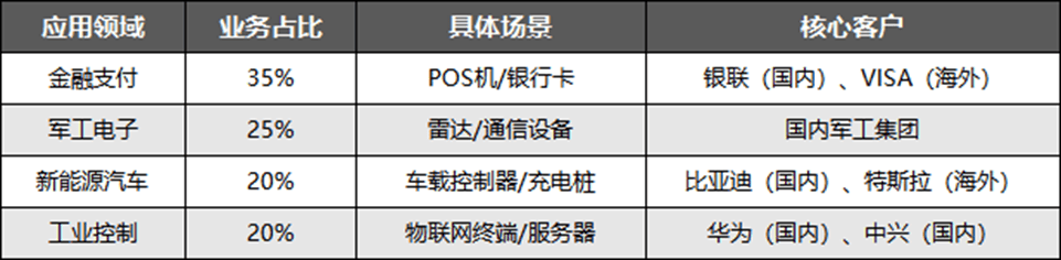 紫光国微核心应用领域集中在金融、军工、新能源汽车与工业控制,四大领域合计占比超90%。标杆客户不仅贡献营收,还驱动产品迭代升级,如军工客户需求推动抗辐射技术突破,汽车客户要求加速车规级认证进程,整体支撑公司技术与市场双升级。